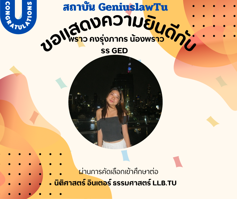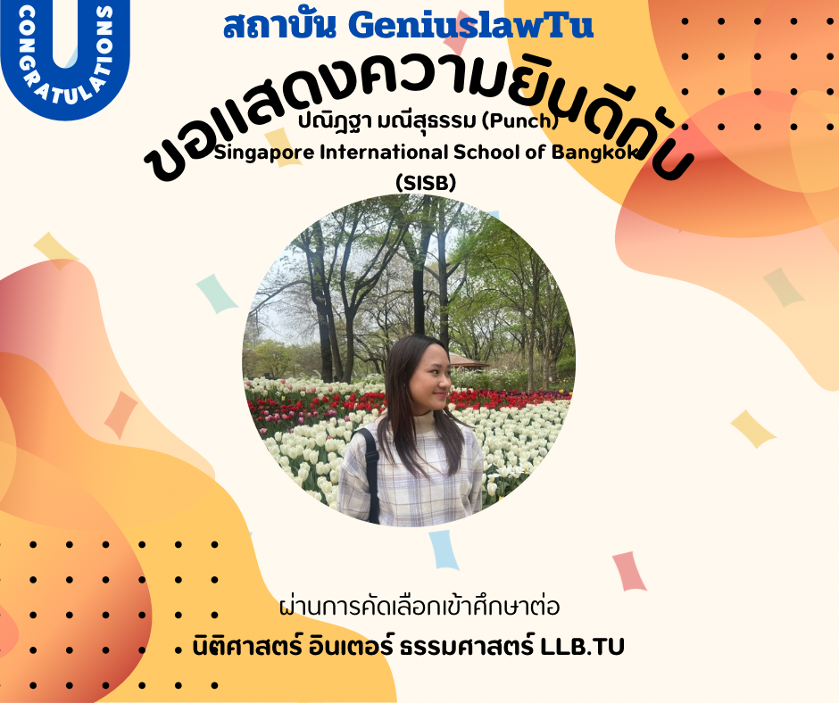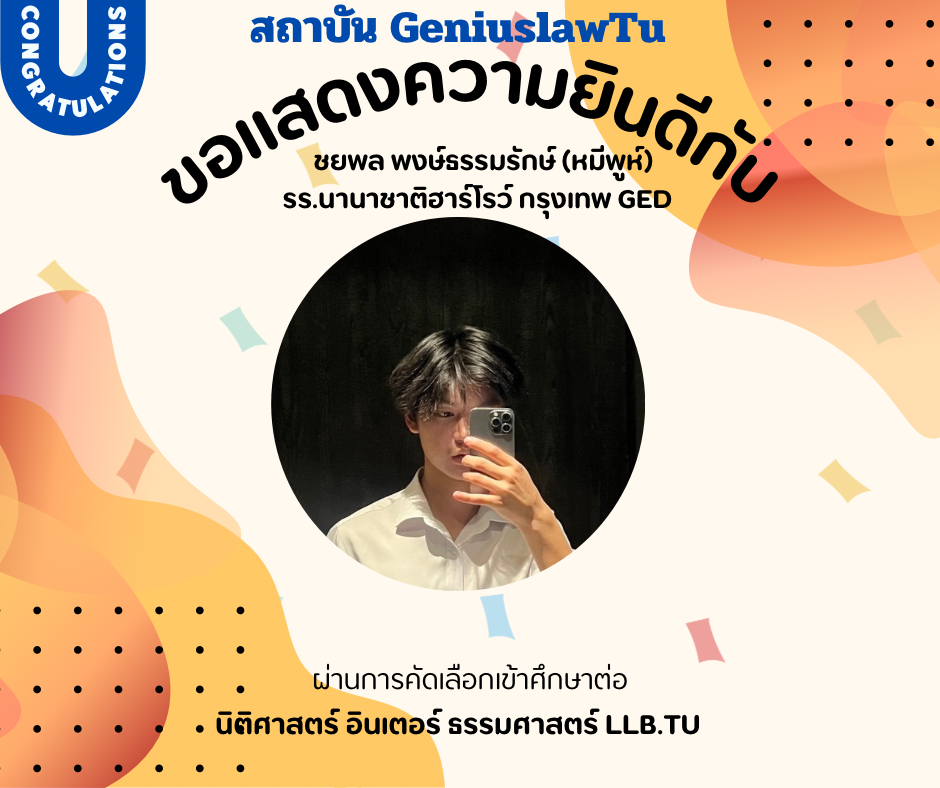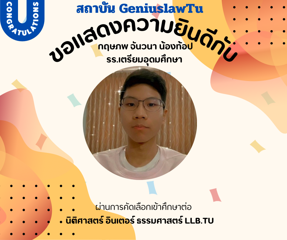 “ความประทับใจที่มีต่อ Genius Law TU ในการช่วยเตรียมตัวสำหรับกระบวนการสัมภาษณ์นั้นไม่สามารถบรรยายได้หมด การเตรียมตัวสัมภาษณ์ที่นี่ได้เน้นไปที่การพัฒนาทักษะการสื่อสารและการนำเสนอตนเองอย่างมืออาชีพ อาจารย์และทีมงานของ Genius Law TU ได้ให้คำแนะนำที่เฉพาะเจาะจงและมีประโยชน์มาก ทำให้ผมได้รับความรู้เกี่ยวกับการตอบคำถามอย่างมีเหตุผลและการเตรียมพร้อมในทุกๆ ด้าน ผมรู้สึกมั่นใจขึ้นอย่างมากเมื่อเข้าสู่ห้องสัมภาษณ์ และผลลัพธ์ที่ออกมาก็เป็นไปในทางที่ดีเยี่ยม”